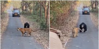 Sloth Bear Captures Attention by Chasing Tigress at Pilibhit Reserve