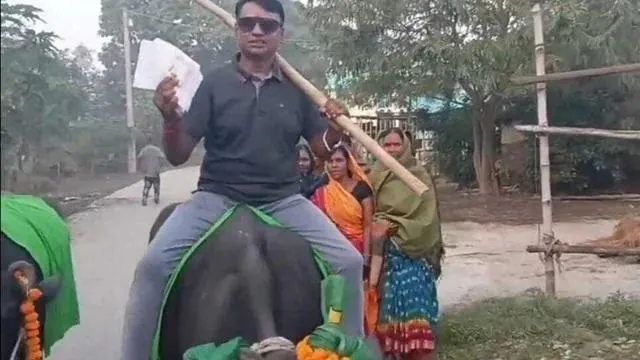 Bihar Elections: Voter goes booth to cast vote riding on buffalo