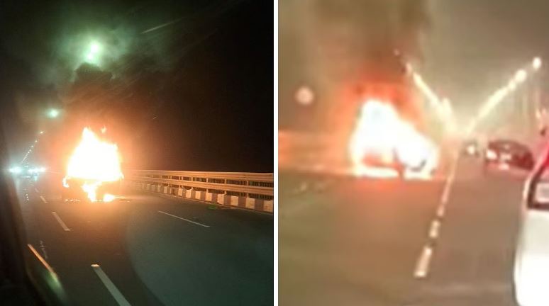Videos later shared online show the sedan reduced to a charred shell as firefighters worked quickly to put out the flames.