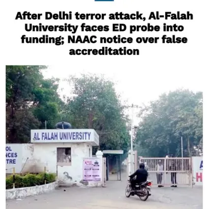 NAAC accreditation related notice was given to the University just 2 days after the blast, after the investigators found links of many doctors at Al-Falah Medical College to the Red Fort blast. University was put under radder after enforcement and regulatory bodies widened their probes.