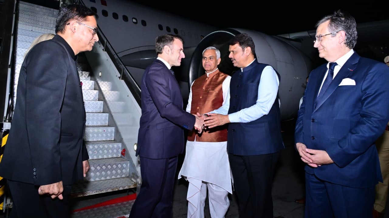 President Macron was received at the Mumbai airport by Maharashtra Governor Acharya Devvrat and Chief Minister Devendra Fadnavis. Deputy Chief Ministers Eknath Shinde and Sunetra Pawar were also present to welcome the French leader and his delegation.