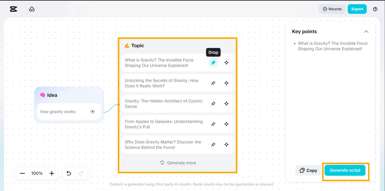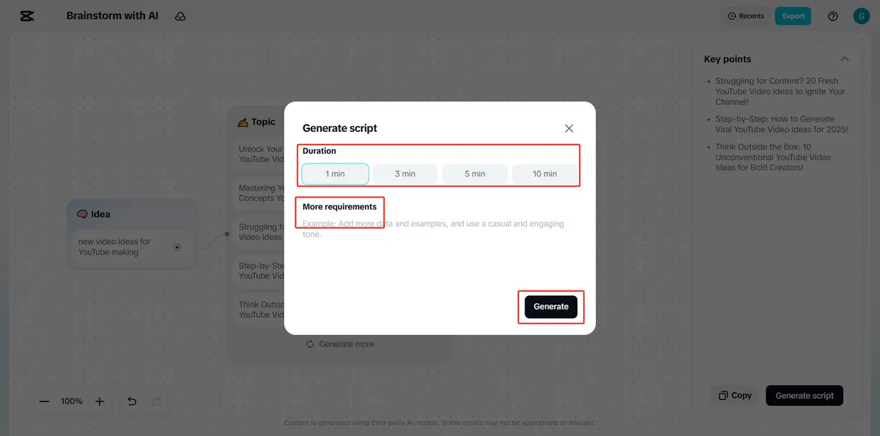 Enter your YouTube video idea into the input field, and the AI will instantly produce a list of recommended topics based on current YouTube trends. You can “Pick” (pin icon) the topics that best fit your concept, or click “Explore” (sparkle icon) to view additional suggestions. Once your topics are selected, they will automatically be converted into key points for your script. To move forward, click “Generate Script.”