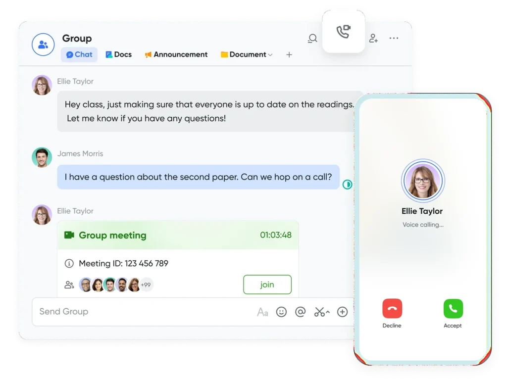 When teams use slow email chains, they frequently don’t talk to each other well. Lark Messenger changes this by making communication in real time the key way to get things done. Teams can establish separate group conversations for each project, tag coworkers to get their feedback right away, and share files in a way that makes sense. All of these characteristics help ideas move ahead quickly.