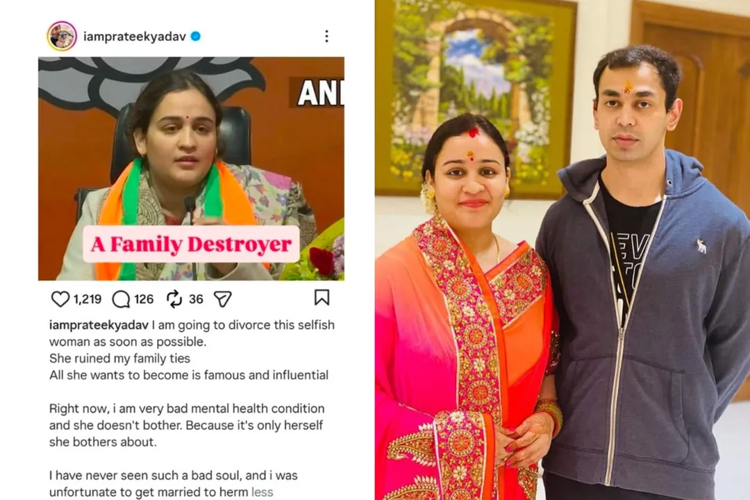 Prateek Yadav, brother of Samajwadi Party chief Akhilesh Yadav and son of late SP founder Mulayam Singh Yadav made an unexpected move. He has confirmed on his social media that he would divorce his wife Aparna Yadav, as she joined BJP. In an Insta post, Prateek Yadav shared a picture of his wife Aparna Yadav and wrote, “I am going to divorce this selfish woman as soon as possible. She ruined my family ties. All she wants to become is famous and influential. Right now, I am in a very bad mental health condition and she doesn’t bother. Because it’s only herself she bothers about. I have never seen such a bad soul, and I was unfortunate to get married to her.”