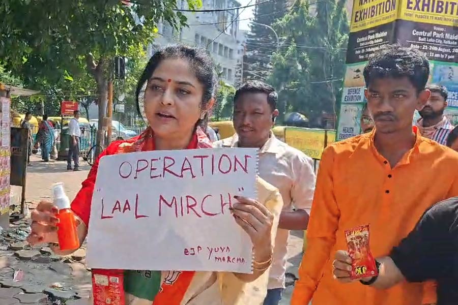 The BJP campaign, ‘Operation Lal Mirch’ (Operation Red Chilli), started from near a metro station in Salt Lake, where women workers of BJP distributed the packets to women commuters, encouraging them to practice self-defence.