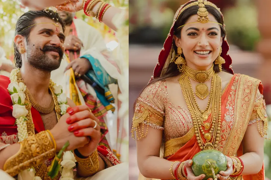Actor Rashmika Mandanna made a striking statement at her wedding to Vijay Deverakonda, adorning 11 bespoke gold jewellery pieces designed exclusively for the ceremony. Crafted by SHREE Jewellers after nearly 10 months of planning, the collection reflected a strong South Indian cultural influence and a royal aesthetic the couple fondly termed the ‘ViRosh’ wedding.