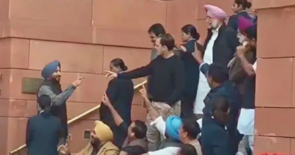विपक्ष के नेता राहुल गांधी अन्य विपक्षी सांसदों के साथ संसद परिसर में विरोध प्रदर्शन कर रहे थे — तभी भाजपा सांसद रवनीत सिंह बिट्टू राहुल गांधी के पास से गुजरे।