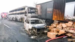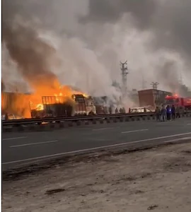 A private bus carrying 50 labourers from Pilibhit, Uttar Pradesh caught fire on the Jaipur-Delhi Highway on Tuesday, two dead and a dozen injured and are in critical condition. This is the second incident this month; another similar incident happened on October 14, when a private AC sleeper caught fire near Thaiyat village in Jaisalmer district, Rajasthan, leaving 20 dead and 15 injured. Today’s incident allegedly happened after a high-tension electricity line came in contact with the bus.