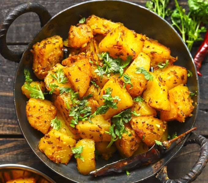 Boiled and cubed potatoes are stir-fried in oil with a blend of spices such as cumin seeds, mustard seeds, coriander powder, turmeric, and red chili powder. The Kumaoni version often features a distinct flavor from wild mustard seeds called jakhiya. The Garhwali version may use jakhya, a local spice with a nutty flavor, instead of cumin seeds. It can be served hot with rice, roti, or chapati, and is also a popular street food or snack enjoyed with evening tea.